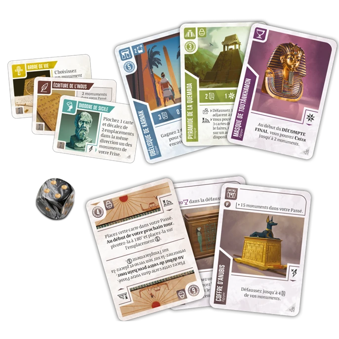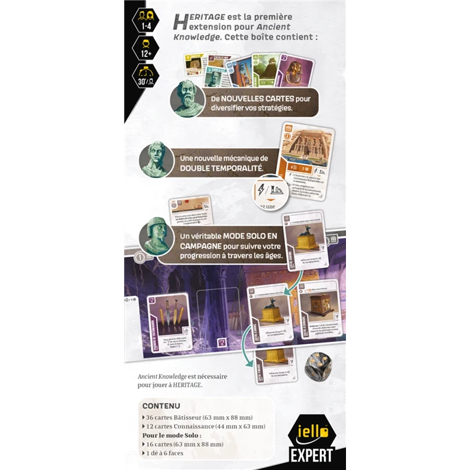 Les cartes Bâtisseur et Connaissance de cette extension ajoutent de nouvelles combinaisons et ouvrent de nouvelles opportunités stratégiques pour vos prochaines parties, aussi bien à plusieurs qu’en solo. Certaines cartes de cette extension ont des effets avec plusieurs temporalités.