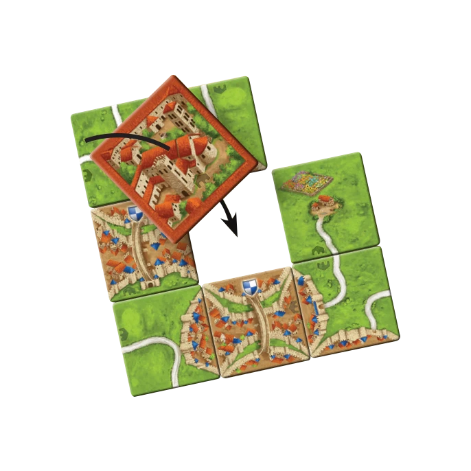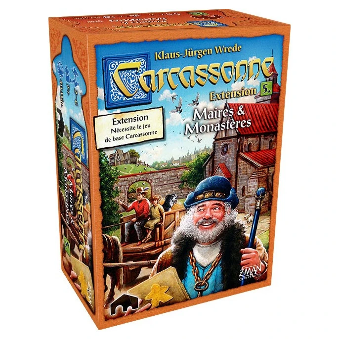 Extension pour Carcassonne incluant un maire, très influent dans les villes, des granges pour décompter les champs, un chariot à déplacer après un décompte et une grande abbaye comblant les trous.