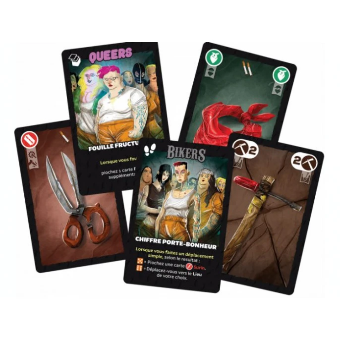 Comme les outils, les armes doivent être improvisées, fabriquées ou achetées avec des cigarettes. Bluff et mémoire sont nécessaires car il faudra faire attention aux cartes qui se trouvent dans la main de chaque joueur. Qui a des outils pour creuser ? Qui a des lames pour se battre ? Pour vous aider, vous pouvez également rejoindre un gang, ou faire appel aux compétences et aux connexions de votre vie passée. En vous déplaçant dans la prison, vous pouvez effectuer diverses actions pour construire votre propre stratégie.
