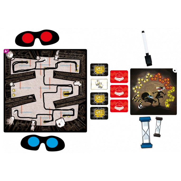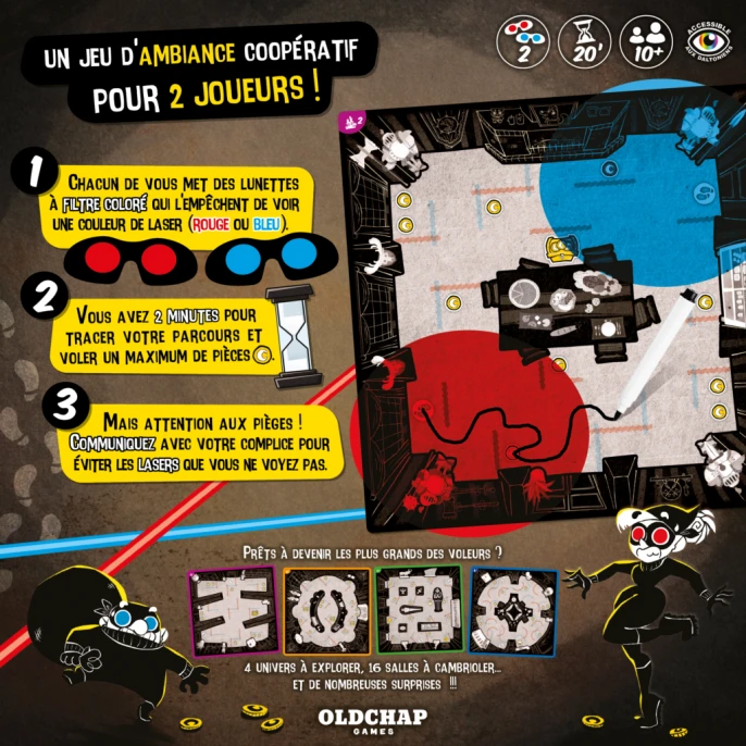 Voleurs en quête de butin, vous devez attraper un maximum de pièces de monnaie sans toucher aux lasers de sécurité. Mais chacun de vous à des lunettes à filtre coloré qui l’empêchent de voir une couleur de laser. Il vous faudra donc communiquer au mieux avec votre complice !