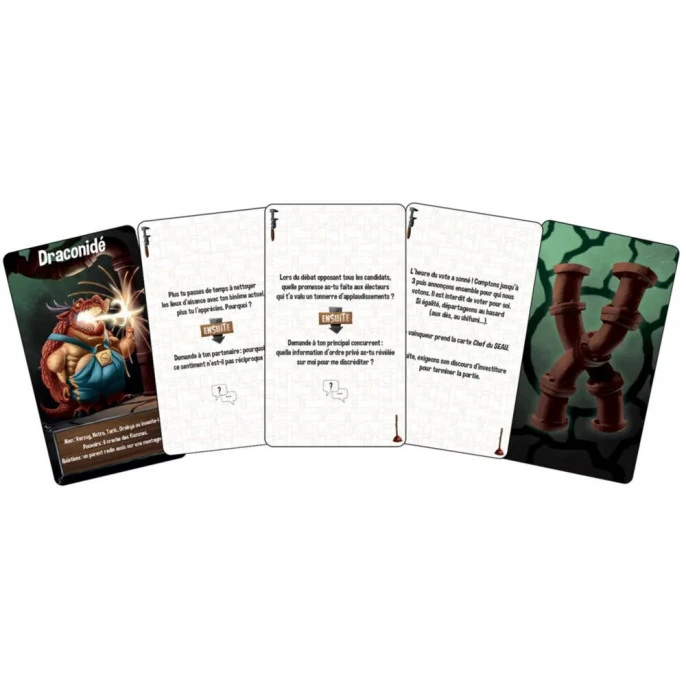 En quelques tours de jeu, vous aurez raconté un récit délirant, mêlant humour et aventure, jusqu’à la carte finale « L’heure du vote a sonné ! ».
