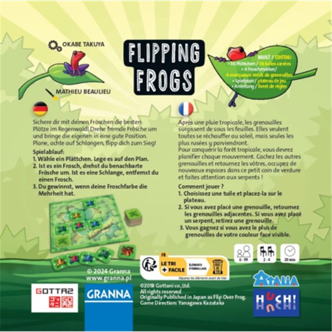 Dans Fliping Frogs, chaque joueur incarne secrètement une couleur de grenouille qu’il doit protéger et faire prospérer. Le but est de placer intelligemment vos grenouilles sur le plateau tout en évitant de dévoiler votre couleur aux autres joueurs. Cachez vos intentions, Retournez les tuiles pour révéler les grenouilles de votre couleur et utilisez les serpents pour éliminer celles de vos adversaires. À la fin, le joueur avec le plus de grenouilles de sa couleur visible sur le plateau gagne la partie.