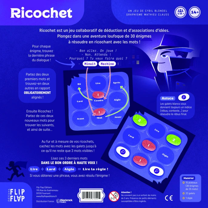 Des jeux d’associations d’idées, il y en a pléthore. Peu ont le charme et l’inventivité de Ricochet. Conçu comme un jeu à joueur seul, il se joue parfaitement à plusieurs. L’inventivité des jeux de mots, l’enchainements des ricochets de mots en fait un exercice ludique distrayant et malin. On approuve !