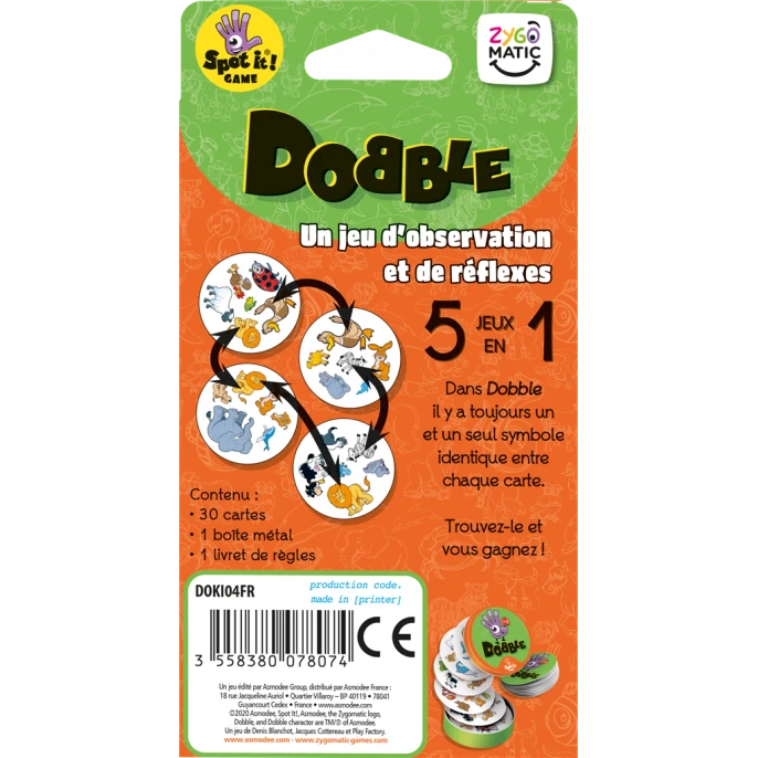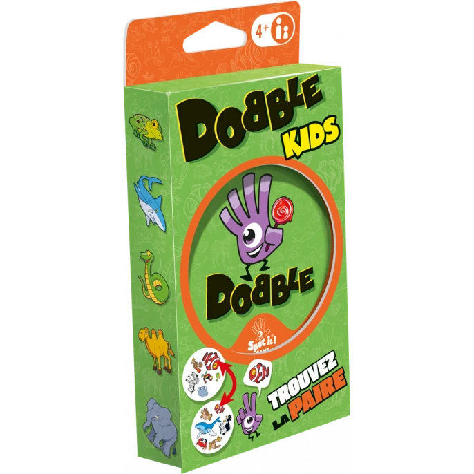 Dobble Kids, ce sont 30 cartes, 30 animaux, et un animal identique entre chaque carte de jeu. Pour gagner, trouvez-le plus vite que vos camarades.