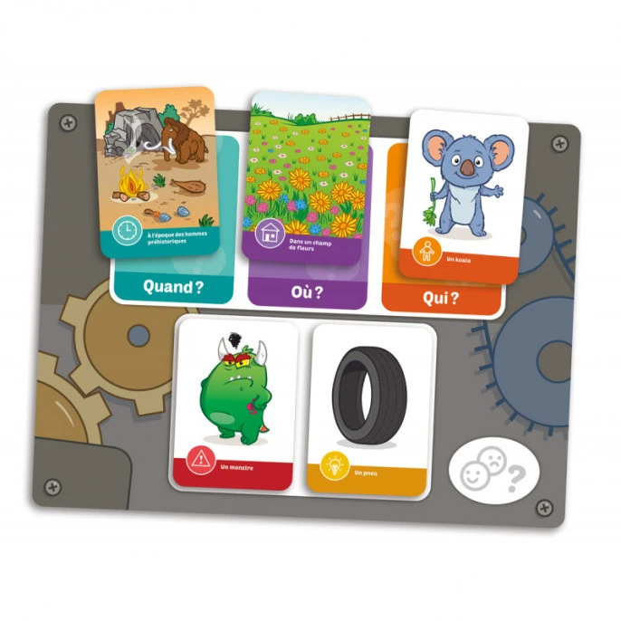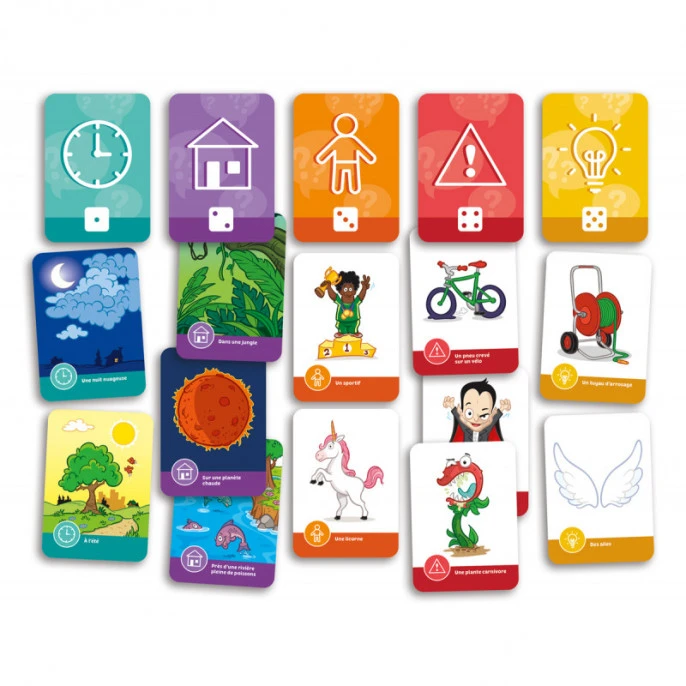 Fais appel à ton imagination pour créer l’histoire la plus amusante! Récolte des cartes qui correspondent au personnage, au lieu, au temps, au problème et à la solution de ton histoire. Raconte-la ensuite aux autres joueurs!
