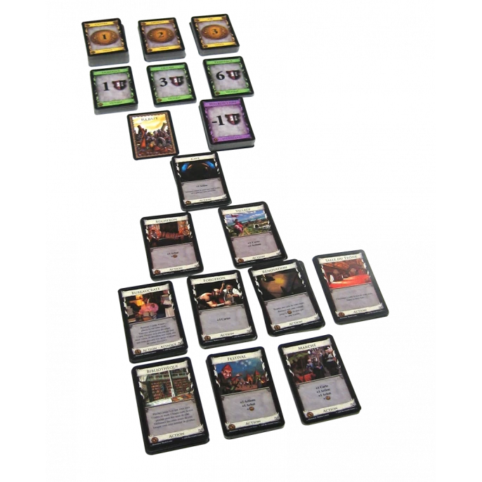 Ces cartes actions vous permettront de jouer plusieurs cartes à la fois, d’acheter plusieurs cartes lors d’un tour, voir même d’avoir plus d’argent disponible. Parfois même elles pourront mettre des bâtons dans les roues de vos adversaires à coup de cartes à jeter ou de cartes malédiction à piocher.