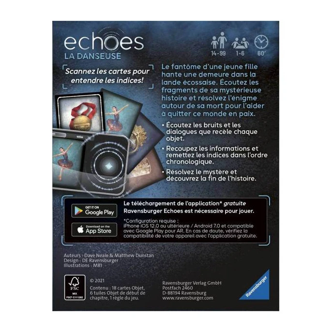 Votre tâche consiste à assembler les 24 parties de l’histoire dans le bon ordre ; chaque partie est représentée par un objet – soit un plateau de jeu soit une carte – et son écho associé. L’histoire entière est divisée en six chapitres, chaque chapitre étant représenté par un plateau de jeu. En scannant les objets avec l’application, vous entendrez l’écho lié à chaque objet, et en utilisant des conversations et des bruits dans l’écho, vous essayez de comprendre quelles trois cartes d’objets sont associées à un chapitre et dans quel ordre elles doivent être mis. Si vous n’avez pas raison, l’application vous indiquera quelles cartes sont incorrectes ou au mauvais endroit ; si vous avez raison, vous pouvez écouter tout le chapitre en une seule fois – et vous devriez le faire, car de nouvelles astuces supplémentaires peuvent alors être entendues. Les objets eux-mêmes vous fournissent également des indices de temps en temps, alors ne négligez aucun détail.