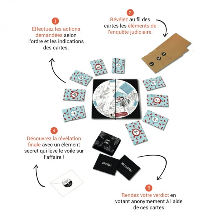 À la fin de la partie, le jury rend son verdict. Le vote se fait anonymement grâce aux cartes de Vote final (« coupable » ou « non coupable »). Une fois le verdict rendu, la Révélation finale peut être dévoilée. Découvrez ensemble une information inédite qui viendra confirmer ou au contraire, remettre en doute votre intime conviction!