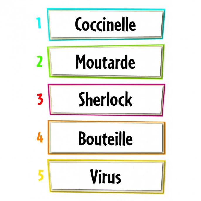 Le joueur actif pioche une carte puis choisit un numéro entre 1 et 5 : il s’agit du mot mystère.
