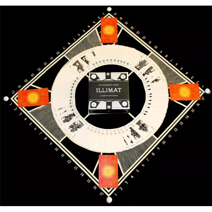 Illimat prend en charge deux à quatre joueurs et un seul tour dure environ quinze minutes. Le plateau en tissu est divisé en quatre champs, et la boîte dans laquelle le jeu entre est également un composant du jeu : elle se trouve au centre du plateau et définit les saisons pour chaque champ, ce qui affecte les actions qui peuvent être effectuées dans chaque champ. champ. Tourner la boîte et changer les saisons est un élément essentiel de la stratégie du jeu.