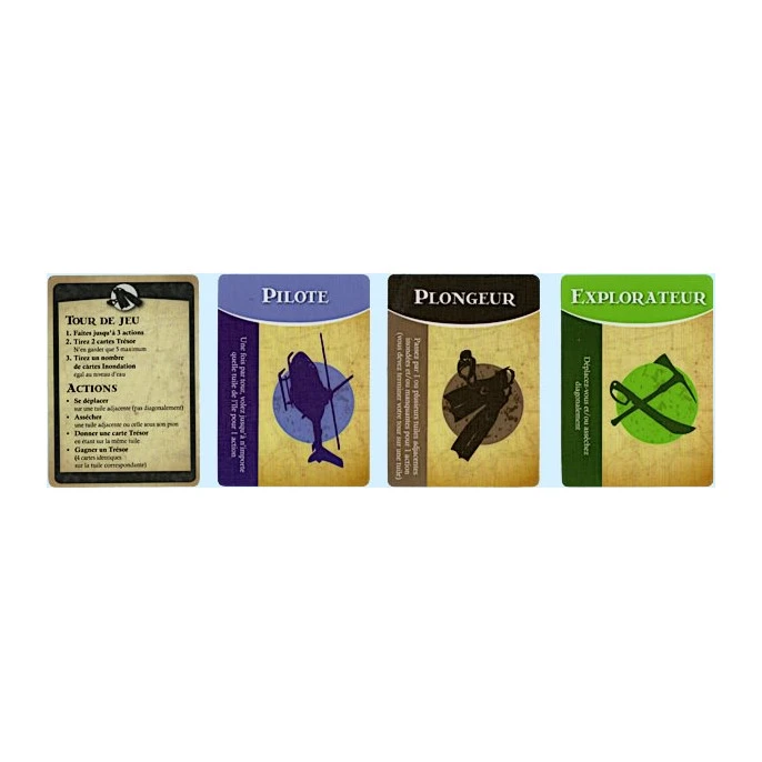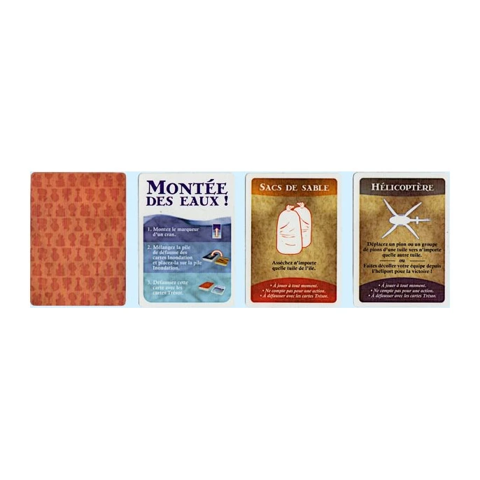 – 58 cartes réparties comme suit : 28 cartes Trésor (dos orange), 5 pour chacun des 4 trésors, 3 cartes Montée des eaux, 3 cartes Hélicoptère, 2 cartes Sacs de sable, 24 cartes Inondation (dos bleu), 6 cartes Aventurier