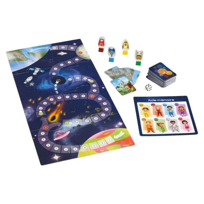 Tu dois montrer aux extraterrestres comment comprendre les émotions, car ils ne savent pas ce que c’est. Aide-les à quitter la planète Padémo pour se rendre sur la Terre et y vivre leur première émotion! Avance en lançant le dé, prends des cartes et devine les émotions ressenties par les personnages illustrés.