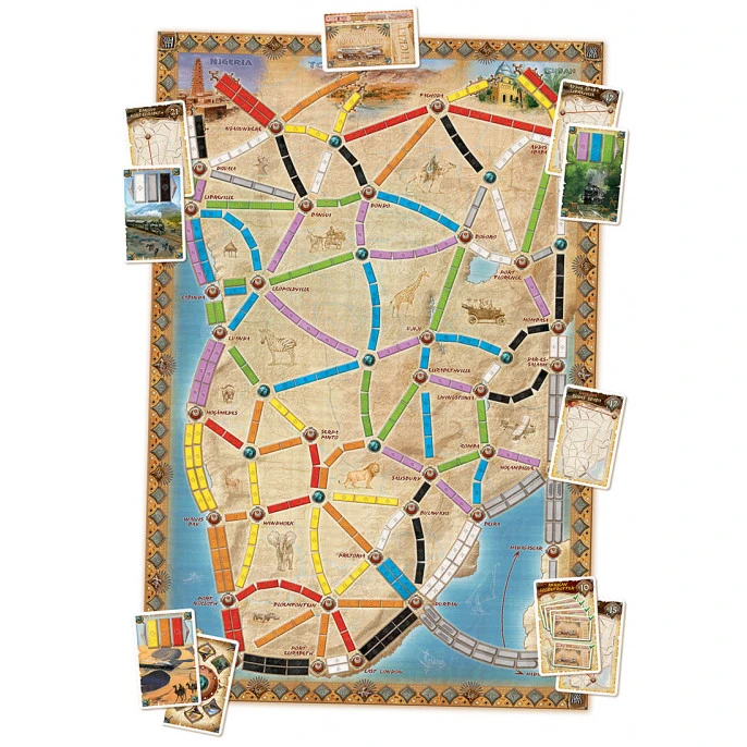 Extension pour les aventuriers du rail se jouant sur le plateau de l’Afrique. De nouvelles cartes, es cartes Terrain, vous permettront de doubler les points de vos routes à condition que vous soyiez le joueur à en posséder le plus.