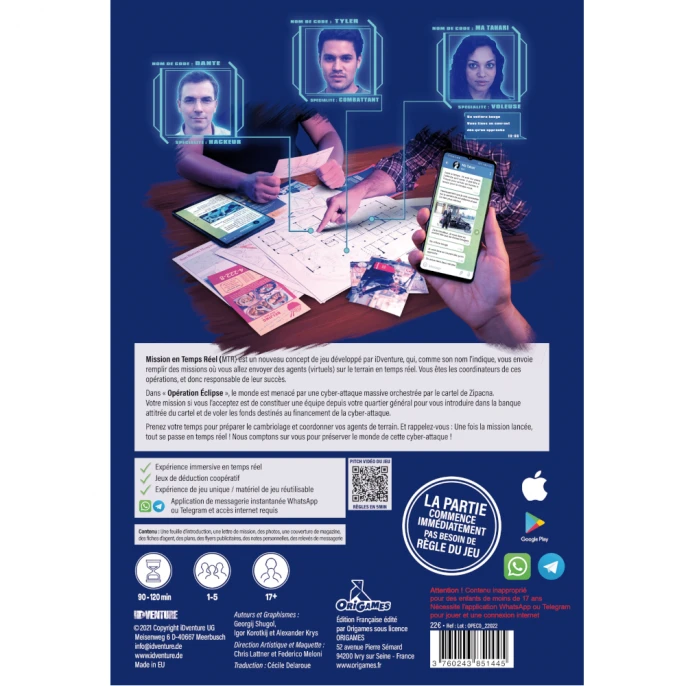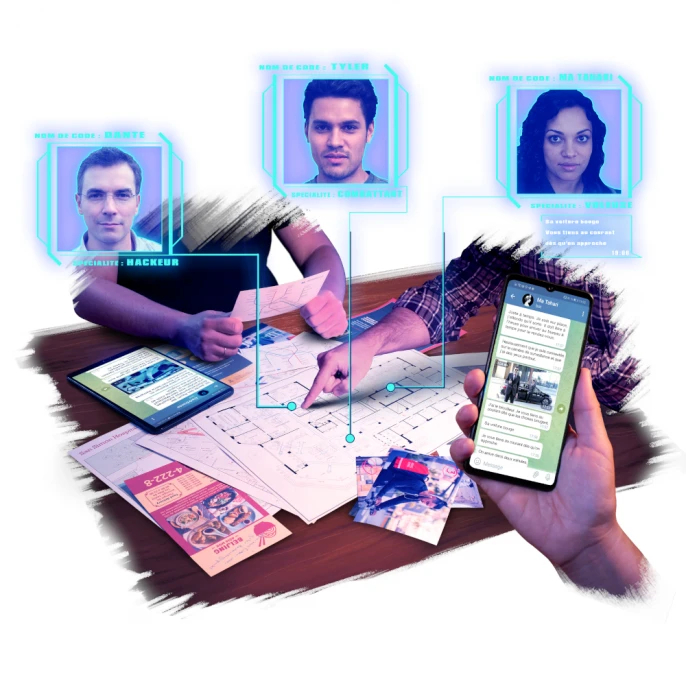 Le monde est menacé par un piratage informatique massif orchestré par le cartel de Zipacna. Pour voler les fonds destinés aux hackers, il faudra s’introduire dans la banque du cartel ! Pour mener à bien votre mission, recrutez des agents et pilotez-les en temps réel grâce à une application (Telegram, Whatsapp). Mission en Temps Réel (MTR) est un nouveau concept de jeu développé par iDventure (Les Flammes d’Adlerstein) qui vous entrainera encore plus loin dans l’immersion !