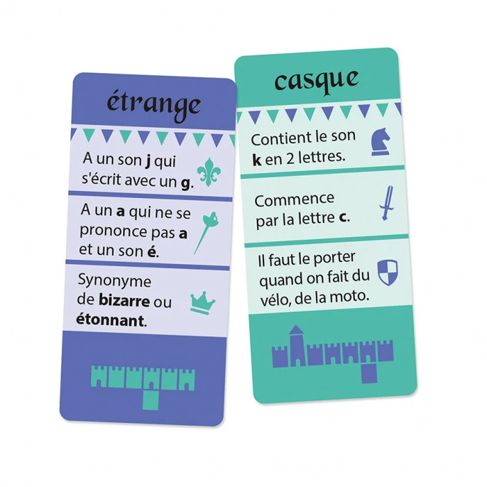 Principe des cartesÂLes cartes sont organisĂ©es en 6 sĂ©ries qui permettent chacune de travailler une famille de difficultĂ©s orthographiques diffĂ©rente. Le jeu contient 100 cartes et 200 mots. Chaque face de carte reprĂ©sente un mot incluant une difficultĂ© orthographique. Les indicesPour chaque mot, il y a 4 indices :Â