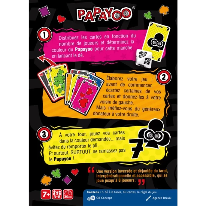 Jeu de pli où le dé indiquera aux joueurs la couleur à ne pas récupérer pour chaque manche. Le 7 de cette couleur sera le Papayoo vous rapportant un énorme malus.
