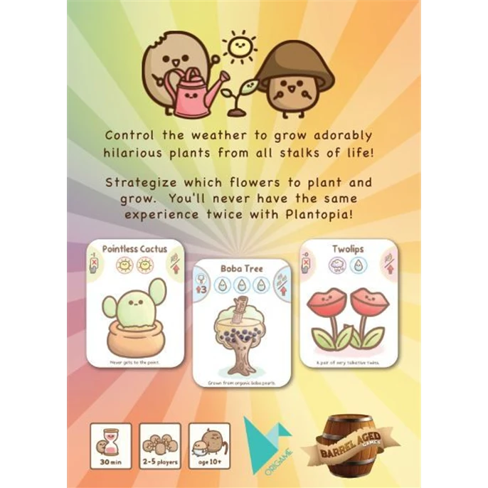 Plantopia is a strategy card-based game where players harness their gardening abilities to contend for the coveted title of Plantopia’s Champion Gardener. Manage the plants in your hand and in your tableau and plant the best combos to earn the most magical leaves. But pay attention to all of your fellow gardeners, as whoever can predict the weather can make their plants grow!