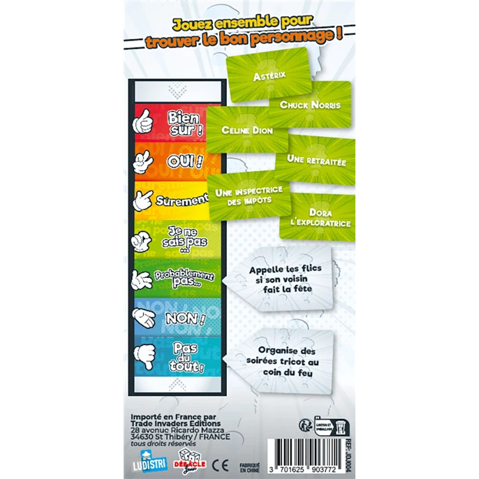 Le Profiler, quant à lui, doit faire deviner son personnage en plaçant 2 cartes le long d’une jauge. Par exemple, il évaluera la carte « manque de maturité » pour Chuck Norris sur une échelle de « Absolument pas ! » à « Évidemment ! ».
