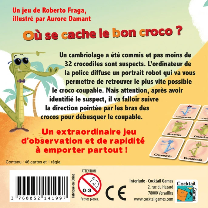 Observez bien les indications données par le portrait-robot de la police, puis trouvez le suspect et suivez sa direction au milieu de 32 cartes crocodiles. Ne vous laissez pas mener en bateau et soyez le plus rapide à démasquer le croco coupable !