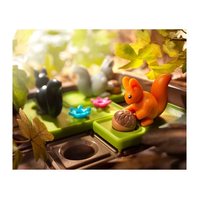 Choisissez un défi parmi les 60 proposés, et bougez intelligemment les écureuils afin que que toutes les noisettes tombent dans les trous prévus sur le plateau de jeu !