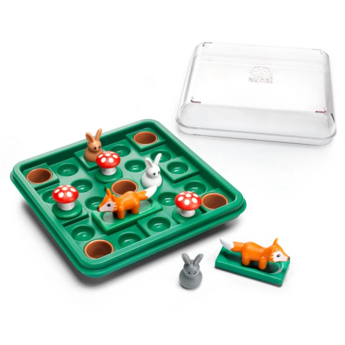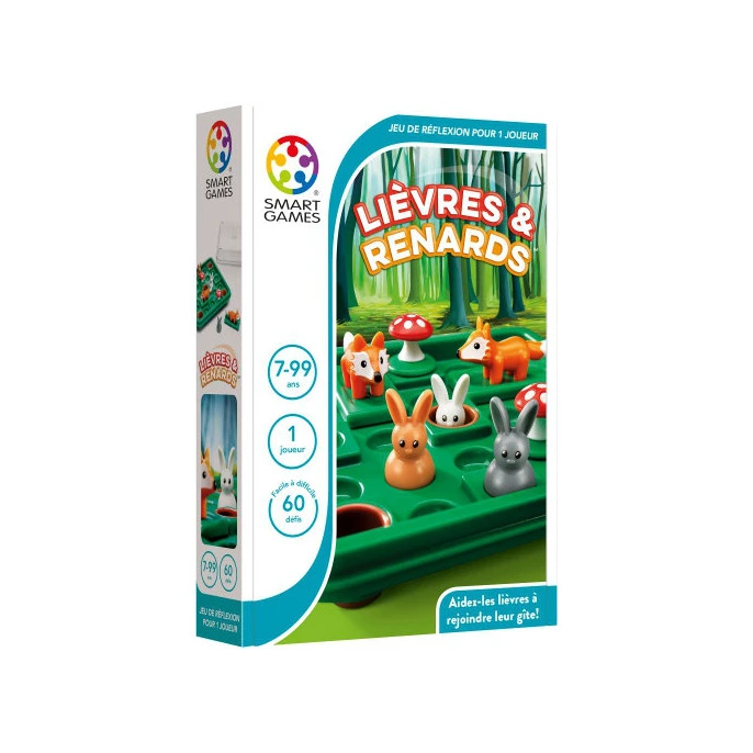 Lièvres et Renards contient 60 défis : les lièvres doivent absolument rejoindre leur terrier pour échapper aux renards. Montez sur les obstacles pour bondir plus loin!