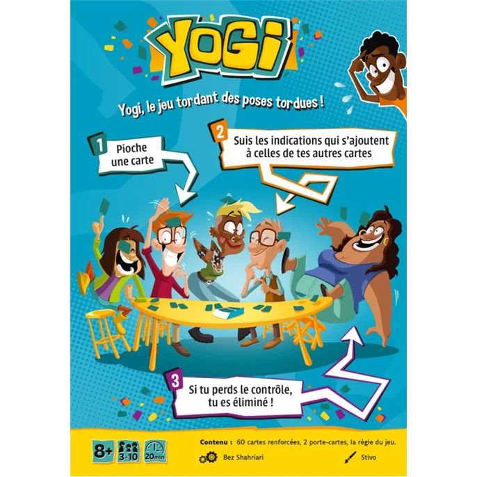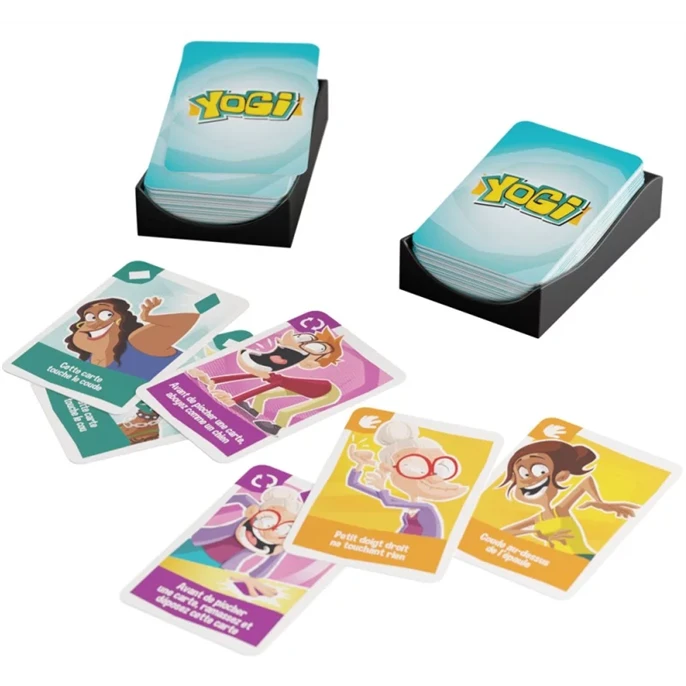 Yogi est un jeu d’ambiance impliquant des défis physiques. A leur tour, les joueurs piochent une carte et doivent suivre le défi imposé. Par exemple «un doigt touche le nez», «le coude gauche au-dessus de l’épaule», « les deux mains doivent se toucher» ou «cette carte sur votre tête». L’instruction sur la carte doit être suivie pour tout le reste du jeu. Mais les cartes s’accumulent et un joueur qui n’arrive plus à respecter tous ses défis est éliminé. Qui sera le dernier en jeu ? Yogi inclut des variantes d’équipe, ainsi qu’une variante sadique où les joueurs imposent des défis à leurs adversaires. L’essayer c’est l’adopter !